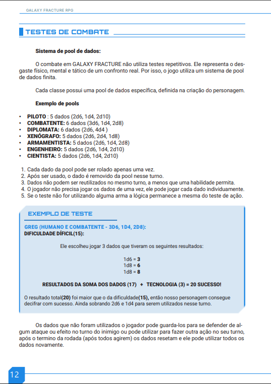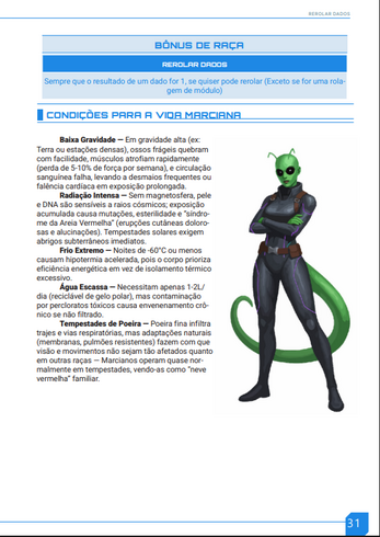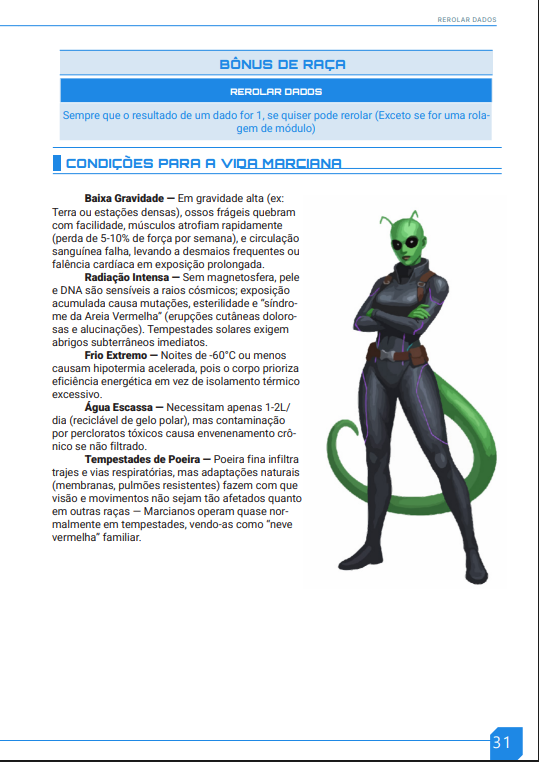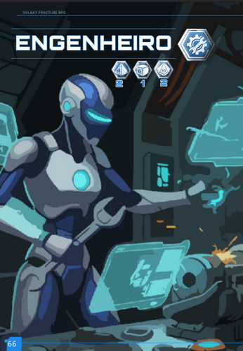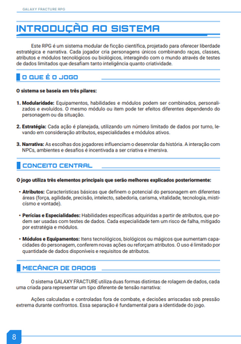 Este RPG é um sistema modular de ficção científica, projetado para oferecer liberdade estratégica e narrativa. Cada jogador cria personagens únicos combinando raças, classes, atributos e módulos tecnológicos ou biológicos, interagindo com o mundo através de testes de dados limitados que desafiam tanto inteligência quanto criatividade.
